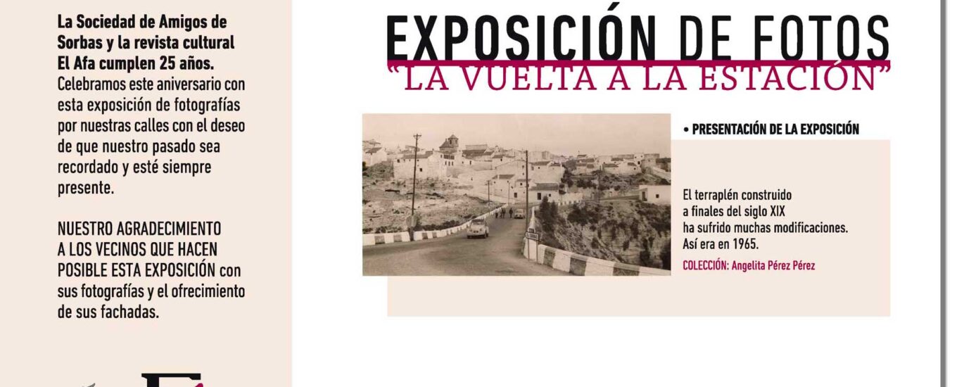 La Exposición de Fotos «La Vuelta a la Estación» es una mirada a la vida y costumbres de Sorbas y los sorbeños. A lo largo de 34 paradas, descubriremos tradiciones, costumbres, personajes y curiosidades que nos harán entender mejor dónde estamos y de dónde venimos. Las rutas interpretadas son visitas amenas pasando por todas las estaciones/paradas en un recorrido a pie por el centro histórico de Sorbas de la mano de Ana María Rodríguez Agüero, historiadora, presidenta de la asociación, gran conocedora de nuestra cultura y tradiciones y apasionada de Sorbas.
